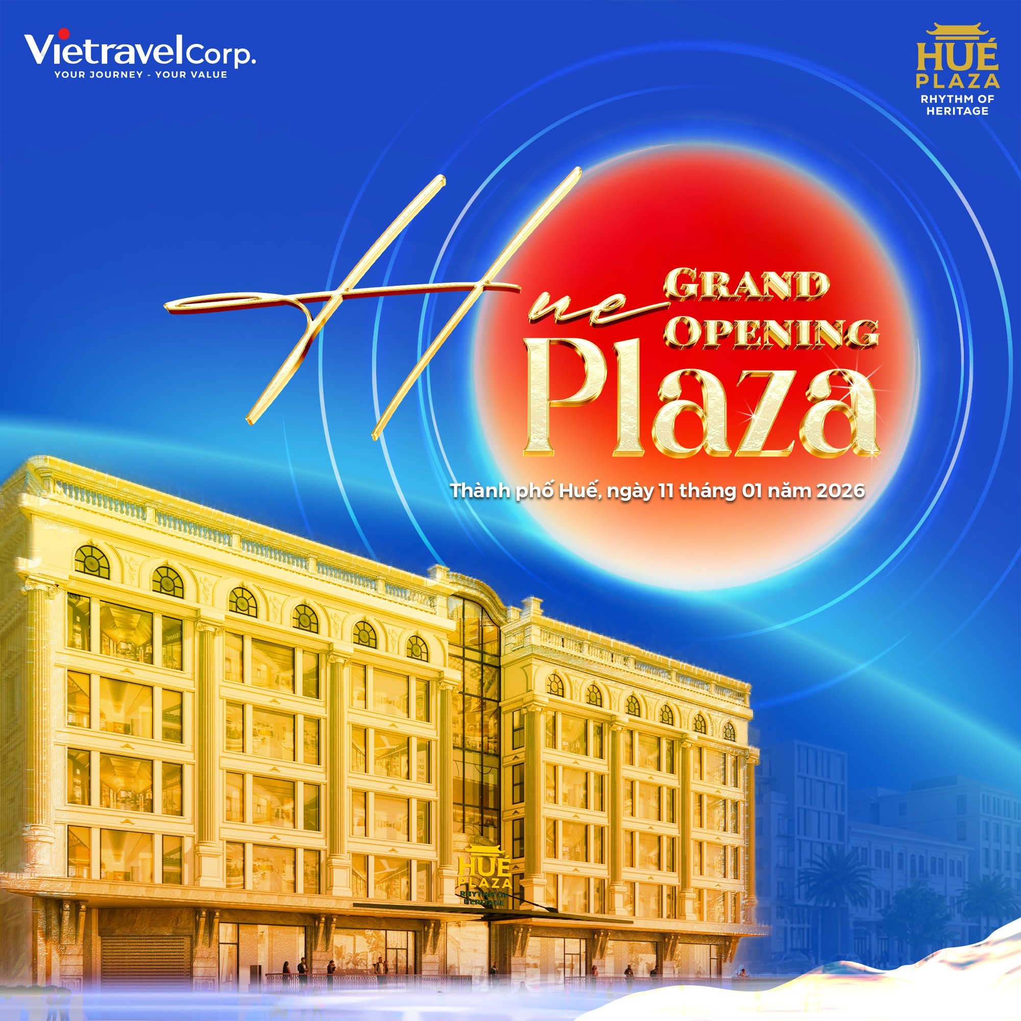 Sự kiện Grand Opening Hué Plaza ngày 11/01/2026 hứa hẹn sẽ mở ra một chương mới cho bức tranh du lịch cố đô – nơi di sản, văn hóa và trải nghiệm hiện đại cùng hội tụ trong một điểm đến.